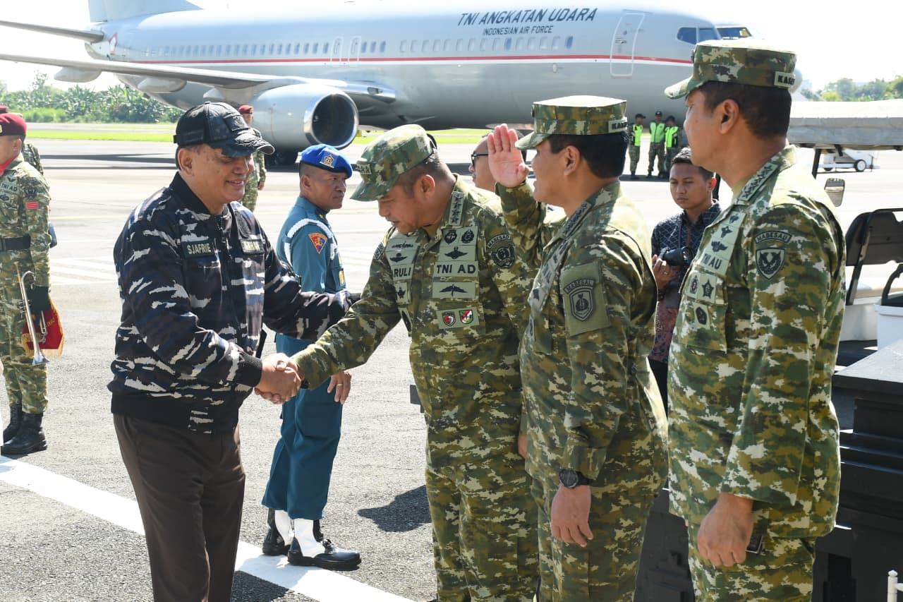 SEMARANG – Pangdam IV/Diponegoro Mayjen TNI Achiruddin, S.E., M.Han., menyambut kunjungan kerja Menteri Pertahanan RI Jenderal TNI (Purn) Dr. Sjafrie Sjamsoeddin dan Panglima TNI Jenderal TNI Agus Subiyanto, S.E., M.Si., di Lanumad Ahmad Yani, Kamis (23/4/2026). Kedatangan rombongan tingkat pusat yang juga didampingi Kepala Staf Angkatan Darat Jenderal TNI Maruli Simanjuntak, M.Sc., ini merupakan bagian dari agenda penguatan pertahanan negara di wilayah Jawa Tengah.